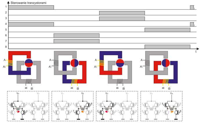 Sterowanie bipolarne silnikami krokowymi jest bardzo podobne do unipolarnego. Przykładowy pełnokrokowy cykl pracy przedstawiono na rysunku 15. W tym przypadku cewka nie jest dzielona, lepsze jest zatem wykorzystanie silnika. Pełny cykl składa się z 4 taktów: A, B\, A\, B. Sekwencja sygnałów sterujących mostkiem jest widoczna na wykresie. Wynika z niej, że w pierwszym takcie włączane są tranzystory 1 i 4, w drugim takcie 6 i 7, w trzecim takcie 2 i 3 i w czwartym takcie 5 i 8. Taką sekwencję musi zapewnić sterownik silnika.