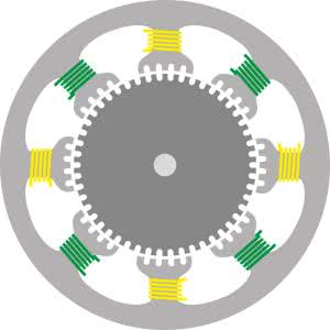 Wirnik silnika VR nie zawiera magnesu stałego (trwałego). Jest zbudowany z tarczy przypominającej koło zębate, która jest wykonana z miękkiego materiału ferromagnetycznego (rysunek 3). Kształt wirnika jest tak dobrany, że reluktancja obwodu magnetycznego zależy od jego położenia. Stojan natomiast zawiera zespół uzwojeń pogrupowanych w przeciwległe pary. Nietrudno zauważyć, że liczba cewek nie jest równa liczbie zębów wirnika. Jest to konieczne do wytworzenia momentu obrotowego powstającego w wyniku dążenia układu do osiągnięcia minimalnej reluktancji. Gdyby nie było tej asymetrii, silnik zatrzymałby się w neutralnym położeniu i jego praca nie byłaby możliwa. Uzwojenia są kolejno przełączane za pośrednictwem odpowiednio skonstruowanego sterownika. Na przykład w silniku przedstawionym na rysunku 3 w pierwszej fazie są włączone cewki A i D. Powoduje to przyciągnięcie do nich zębów odpowiednio 1 i 3. W kolejnym kroku zostaną włączone uzwojenia B i E, a ponieważ najbliżej nich w poprzednim ustawieniu znajdowały się zęby odpowiednio 2 i 4, to one zostaną przyciągnięte do tych uzwojeń. Podobnie wyglądają kolejne fazy. Jak widać, rotor tego silnika będzie się obracał w prawo, w każdym kroku o 15°. Silniki ze zmienną reluktancją są obecnie wypierane przez silniki innych typów.