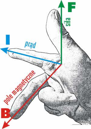 Rysunek 2. Reguła 3 palców prawej ręki pozwalająca określić zwrot siły elektrodynamicznej