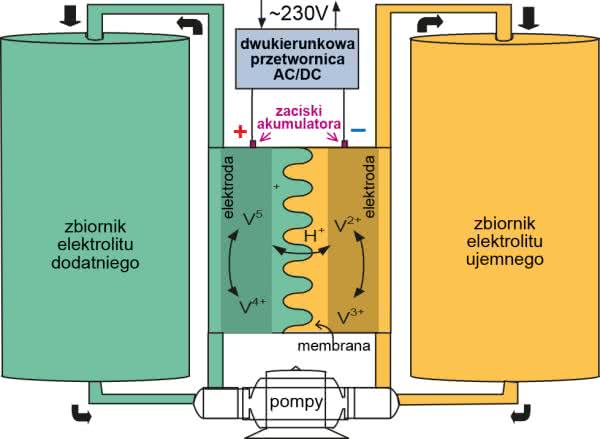 Jedną z zalet akumulatorów przepływowych jest to, że ich pojemność nie zależy od wielkości ogniwa, tylko od ilości elektrolitu, zgromadzonego w oddzielnych zbiornikach. Natomiast wielkość ogniwa – reaktora decyduje tylko, jaką chwilową moc maksymalną może mieć akumulator, to znaczy z jakimi prądami ładowania i rozładowania może pracować. Budowę akumulatora wanadowego ilustruje rysunek 4.