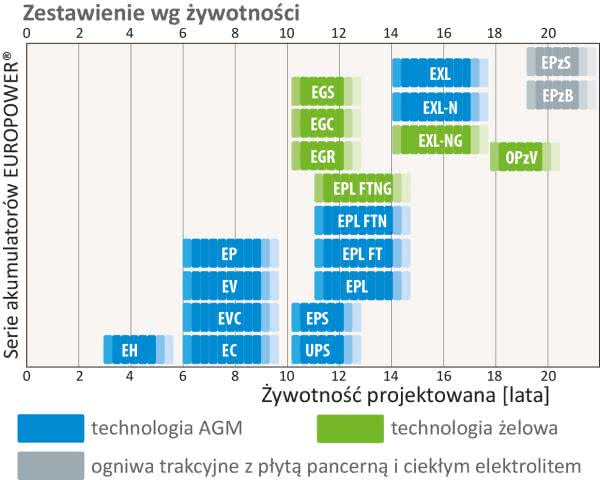 Otóż budowa i szczegóły składu chemicznego akumulatorów kwasowo-ołowiowych optymalizowane są do określonych zastosowań i określonego rodzaju pracy. Znane chyba każdemu, dwa podstawowe, skraje rodzaje to praca buforowa i praca cykliczna. Ale w licznych zastosowaniach akumulator pracuje w trybie pośrednim, pomiędzy czystą pracą buforową, a pracą cykliczną. Klasyczny przykład pracy buforowej to 12-woltowy akumulator w urządzeniu UPS, który cały czas pozostaje po napięciem 13,5...13,8 V, a pracuje – oddaje energię tylko w bardzo rzadkich chwilach, gdy zabraknie prądu w sieci energetycznej 230 V. Kluczowym parametrem przy pracy buforowej jest trwałość, która dla różnych odmian akumulatorów i różnych producentów wynosi od 3 do kilkunastu, a nawet aż do 20 lat.