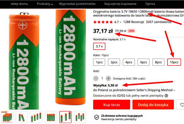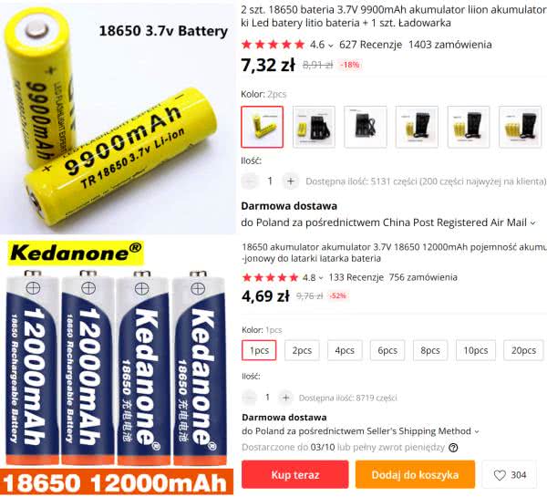 Rysunek 14 pokazuje tego rodzaju ofertę (Aliexpress), a rysunek 15 – dwie kolejne, równie atrakcyjne. Przy pojemności 12800 mAh (12,8Ah), napięciu nominalnym 3,7 V, masie ogniwa około 47 g i cenie około 4,3 zł/szt. (37,17 zł+5,5 zł)/10 szt. uzyskalibyśmy rewelacyjną ilość energii 36,7 Wh, rewelacyjną gęstość energii 780 Wh/kg i rewelacyjną jak na akumulatory cenę niecałe 12 groszy za watogodzinę. To są wartości wzięte z sufitu, a pomiary pokazują, że realna pojemność tego rodzaju superakumulatorów jest często dziesięć razy mniejsza od deklarowanej.