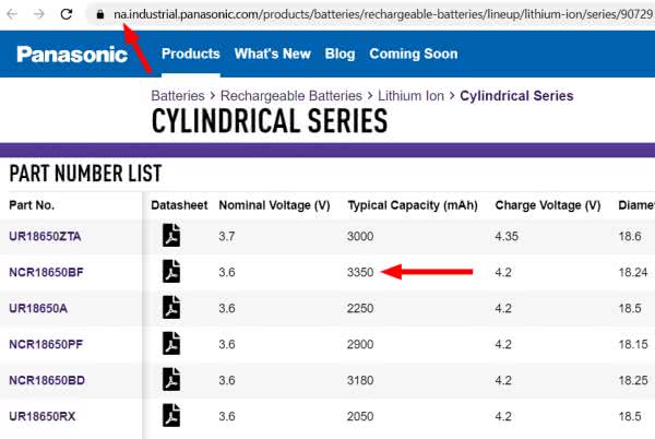 Jak pokazuje rysunek 12, zrzut z europejskiej strony https://bit.ly/372oQq8, aktualnie jest to najlepsza z oferowanych wersji, a w ofercie dla Ameryki (https://bit.ly/2FLeRtp), najlepsza jest wersja NCR18650BF (rysunek 13) o pojemności typowej 3350 mAh i minimalnej 3250 mAh. W ofercie renomowanych producentów jak LG, Samsung czy Sony znajdziemy podobne oferty z najlepszymi wersjami do 3600 mAh.