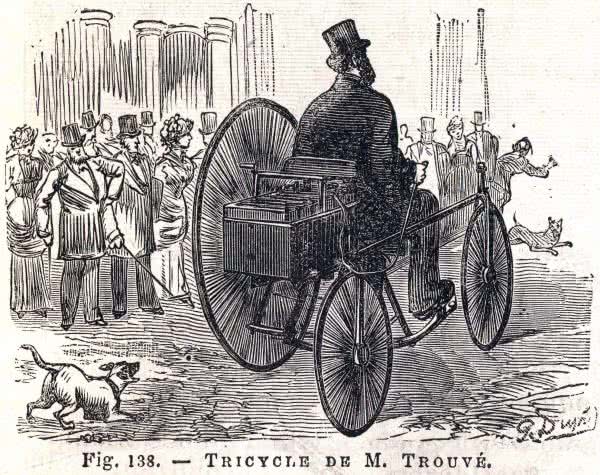 Co ciekawe, samochody, ściślej pojazdy elektryczne (EV – electric vehicle) pojawiły się znacznie wcześniej niż spalinowe! Podobno już w roku 1828 Ányos Jedlik, uważany przez Węgrów za wynalazcę silnika elektrycznego (i prądnicy), zastosował swój prymitywny silnik do napędu modelu pojazdu elektrycznego. W latach 30. XIX wieku pojawiły sie prototypy pojazdów elektrycznych z bateriami jednorazowymi. Przełomem było wynalezienia akumulatora ołowiowego (Planté) i jego udoskonalenie (Camille Faure – 1881). W efekcie już pod koniec roku 1881 na Międzynarodowej Wystawie Elektrycznej w Paryżu Gustave Trouvé zaprezentował pojazd elektryczny (tricykl) z akumulatorem, pokazany na rysunku 3. W latach 80. XIX wieku pojawiły się samochody elektryczne w Wielkiej Brytanii i Niemczech. W roku 1897 na ulice miast po obu stronach Atlantyku wyjechały taksówki elektryczne. Do przełomu wieków wyprodukowano około 30000 pojazdów elektrycznych.