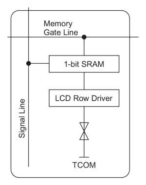Pierwszą z nich, promowaną głównie przez firmę Sharp, jest konkurująca bezpośrednio z elektronicznym papierem EPD technologia MIP (pamięć wbudowana w piksel). Budowa matrycy wyświetlającej jest identyczna jak LCD, każdy sterowany piksel znajduje się w przecięciu układu kolumn i wierszy, stan ciekłego kryształu nie jest jednak zmieniany bezpośrednio z kontrolera, lecz jest zapamiętywany w komórce pamięci sterującej driverem piksela. Dzięki integracji pamięci z driverem nie ma potrzeby ciągłego odświeżania ekranu, gdyż stan piksela przechowywany jest w pamięci „podręcznej” samego wyświetlacza. Schematyczną budowę komórki pokazano na rysunku 1.