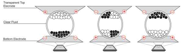 Wyświetlacze EPD wykorzystują do wyświetlenia obrazu naturalne światło otoczenia oraz zjawisko elektroforezy. Zjawisko polega na zmianie ruchu cząstek fazy ciekłej atramentu umieszczonego w mikrokapsułkach pomiędzy elektrodami. W zależności od wytworzonego przez elektrody pola elektrycznego, cząsteczki atramentu zmieniają swoje położenie. Przykładowy sposób wyświetlania obrazu pokazano na rysunku 2, w tym przypadku jest to EPD składający się z dwóch pigmentów umieszczonych w przeźroczystym płynie. W uproszczeniu zasada działania jest następująca, gdy do elektrod pomiędzy którymi znajduje się mikrokapsułka wypełniona cząsteczkami pigmentu białego (naładowanego ujemnie) i czarnego (naładowanego dodatnio) przyłożymy napięcie, wytworzone pole elektryczne spowoduje zmianę orientacji kapsułek. Wpływając na rozkład tego pola możemy ustawić pigment biały od strony użytkownika, wtedy zobaczy on biały ekran. Zmieniając kolejno rozkład pola możemy zorientować w kierunku użytkownika kapsułki z czarnym atramentem czyniąc ekran czarnym lub odpowiednio sterując polem uzyskać stopniowane wymieszanie kapsułek obserwowane jako gradacja szarości.