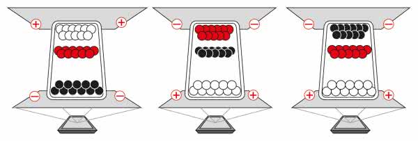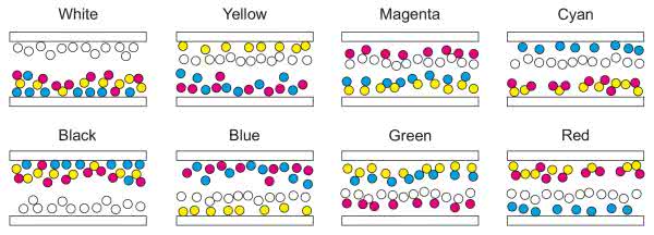Cechą, nad którą prowadzono intensywne prace rozwojowe, było uzyskanie na EPD obrazu kolorowego. Pierwszą grupą wprowadzającą kolor do wyświetlaczy EPD jest seria E Ink Spectra, opracowana na potrzeby systemów etykiet elektronicznych ESL (Electronic Shelf Label). Doskonale sprawdzają się w tych zastosowaniach wyświetlacze o niewielkich przekątnych ekranu z dodatkowym wyróżniającym pigmentem kolorowym, mieszczące się na krawędzi półki magazynowej. Nie obsługują one oczywiście pełnej palety RGB, ale czasem takie proste wyróżnienie wystarczająco podnosi czytelność i atrakcyjność wyświetlacza. Kontrastowy kolor działa na nas jak odblaskowy gruby marker, a jak wiadomo przykucie uwagi to połowa sukcesu w handlu. Najczęściej, oprócz standardowego pigmentu białego i czarnego, jako wyróżniający stosowany jest pigment czerwony lub żółty. Zasada pracy wyświetlacza jest podobna do dwubarwnego, dwa pigmenty czarny i biały, zostają uzupełnione pigmentem w kolorze czerwonym lub żółtym (zapowiadane są także inne kolory). Pigmenty zamykane są w pojemnikach nazwanych przez producenta Microcups (rysunek 3). Barwnik czerwony podobnie jak biały naładowany jest dodatnio, a sterowanie polem elektrycznym o nieco większej komplikacji w porównaniu z wyświetlaczem monochromatycznym umożliwia ustawianie pigmentów w odpowiedniej kolejności dla uzyskania trójkolorowego obrazu.