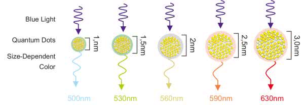 Wyświetlacze Quantum Dot Display wykorzystują „nano-kropki” kwantowe, które są zdolne do generowania światła o ściśle określonej długości fali. Dobierając rozmiar kropki, co pokazano na rysunku 6, możemy generować składowe RGB konieczne do uzyskania obrazu kolorowego. Ze względu na fakt, że zmiana koloru świecenia nie wymaga zmiany materiału nano-kropki, tak jak ma to miejsce w przypadku klasycznych LED, uproszczony został proces produkcji. Komercyjnie wyświetlacze QD znalazły się w telewizorach 8K. Zaletą QD jest bardzo wierne oddanie koloru, wysoki kontrast i sprawność energetyczna, a także niższe koszty produkcji w porównaniu z OLED.