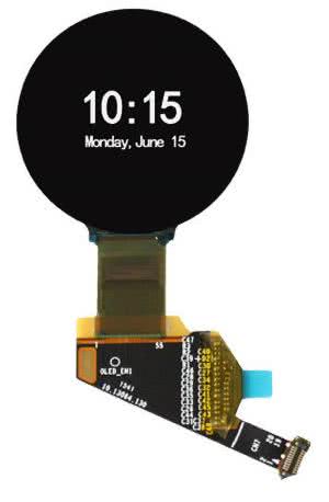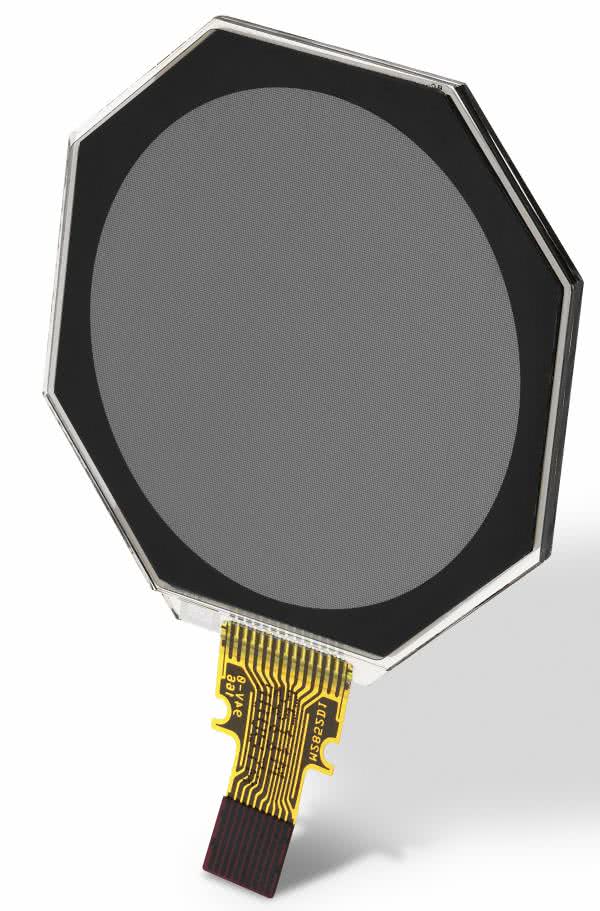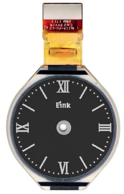 Oczywiście oprócz powszechnych wyświetlaczy o prostokątnym kształcie ekranu coraz popularniejsze stają się wyświetlacze graficzne o okrągłym polu odczytowym. Te ostatnie zaprojektowane są do użycia w monitorach parametrów medycznych, przyrządach pomiarowych lub inteligentnych zegarkach gdzie mogą konkurować z bardziej energochłonnymi wyświetlaczami OLED. Średnica pola odczytowego wyświetlacza ET011TT2 to 1,1” przy rozdzielczości 240×240 pikseli (218 dpi) i czterech stopniach szarości, całkowita grubość wyświetlacza to 0,53 mm przy wadze 0,72 g. Czas odświeżania ekranu wynosi 0,8 s. Ciekawostką jest wyświetlacz ET011TJ2 pokazany na fotografii 9, podobny do ET011TT2, ale posiadający otwór pod mocowanie klasycznego wskazówkowego mechanizmu zegarka – czyli z przymrużeniem oka, pierwszy wyświetlacz hybrydowy łączący EPD z wyświetlaczem elektromechanicznym.