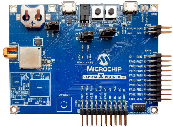 Najważniejszym elementem modułu jest oczywiście mikrokontroler. Seria SAMR34 ma 32-bitowy rdzeń ARM Cortex M0+ połączony z wbudowanym tranceiverem UHF wspierającym standard LoRa z modulacją FSK. Rdzeń może być taktowany maksymalną częstotliwością 48 MHz.