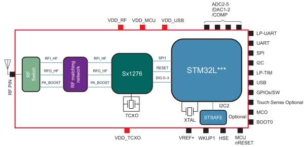 Podstawowym elementem zestawu jest zintegrowany moduł CMWX1ZZABZ-091 produkcji firmy Murata zawierający mikrokontroler rodziny STM32L072, lub STM32L082, transceiver SEMTECH SX1276 wyposażony w modem LoRa, oraz wszystkie niezbędne układy wielkiej częstotliwości. Schemat blokowy modułu został pokazany na rysunku 9. CMWX1ZZABZ-091 jest dostarczany w postaci zaekranowanego modułu z wyprowadzeniami do montażu powierzchniowego.