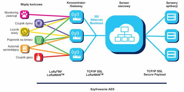 Na rysunku 8 pokazano strukturę sieci LoRaWAN. Węzły (urządzenia końcowe – czujniki) łączą się z koncentratorami za pomocą protokołu LoRaWAN RF. Koncentratory przesyłają dane do serwerów sieciowych standardowym połączeniem wykorzystującym protokoły LoRaWAN TCP/IP SSL (Wi-Fi, Ethernet), lub za pomocą usługi dostępowej w sieciach GSM (3G/LTE). Sieć jest zbudowana z czterech głównych komponentów: