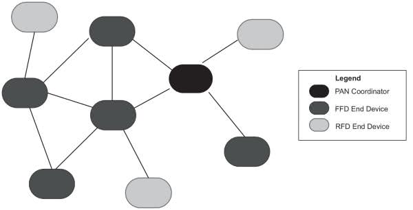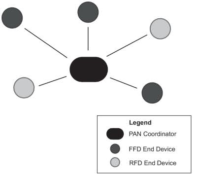 W topologii gwiazdy pokazanej na rysunku 6 koordynator PAN inicjuje wymianę danych i akceptuje połączenia przychodzące od urządzeń w sieci. Urządzenia końcowe FFD lub RFD mogą ustanowić połączenie tylko z koordynatorem PAN. W urządzeniach FFD transceiver jest zawsze włączony i urządzenia te są zasilane z sieci energetycznej.