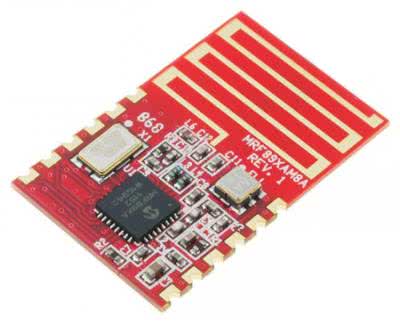 Na fotografii 5 pokazano moduł trasceivera MRF89XAM8A wpierającego sprzętowo funkcje warstwy MAC. Moduł jest przeznaczony do pracy z częstotliwościami 863...870 MHz z modulacją FSK, lub OOK (ASK). Maksymalne przepływności danych dla modulacji FSK wynoszą 40 kbps, a dla OOK 16 kbps. Moduł komunikuje się z mikrokontrolerami PIC za pomocą interfejsu SPI.
