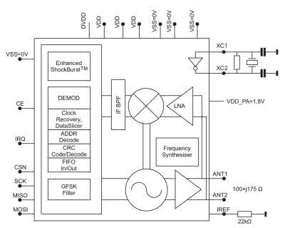 Schemat blokowy serca modułu, czyli układu nRF24L01 został pokazany na rysunku 2. Układ pracuje w paśmie ISM 2,4...2,5 GHz z modulacją GFSK. Jest to zmodyfikowana wersja modulacji FSK, w której strumień danych wejściowych poddaje się filtrowaniu cyfrowemu przez filtr Gaussa (GFSK Filter) (rysunek 2). Układ ma wbudowany kompletny tor radiowy z syntetyzatorem częstotliwości, wzmacniaczem pośredniej częstotliwości i wzmacniaczem antenowym. Może pełnić rolę nadajnika i odbiornika w trybie pracy half duplex. Dostępne pasmo radiowe zostało podzielone na 125 kanałów. Czas przełączania pomiędzy kanałami jest krótszy niż 200 μs.