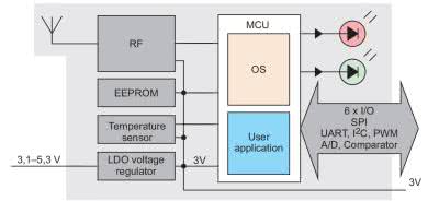 Użytkownik ma do dyspozycji część pamięci programu mikrokontrolera i może tam umieszczać swój firmware napisany w języku C współpracujący z wbudowanym OS (rysunek 3). Wydajność bardzo prostego rdzenia mikrokontrolera PIC16F i dostępne zasoby nie pozwalają na zaimplementowanie bardziej zaawansowanych protokołów radiowych, ale do prostych zastosowań bardzo się przydaje elastyczne połączenie mikrokontrolera wspieranego przez prosty OS z modułem radiowym.