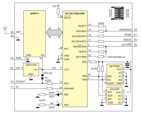 Obecnie oferowana jest kolejna generacja modułów. W torze radiowym pracuje układ SPIRIT1 produkcji STMicroelctronics. Mikrokontroler to jednostka Microchipa PIC16LF1938 ze znanym i prostym rdzeniem 8-bitowym PIC16F. Na płytce modułu zamontowano sensor temperatury MCP9808 i pamięć EEPROM 24AA256 o pojemności 256 kb. Schemat modułu TR72 został pokazany na rysunku 4. SPIRIT1 może pracować w pasmach 150...174 MHz, 300...348 MHz, 387...470 MHz, 779...956 MHz. To pozwala dobierać pasmo, w którym moduł będzie działał. Wybrane pasmo częstotliwości musi być dopuszczone do stosowania bez zezwolenia w kraju, w którym moduł będzie używany. W Europie jest to pasmo 868 MHz ISM.