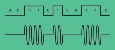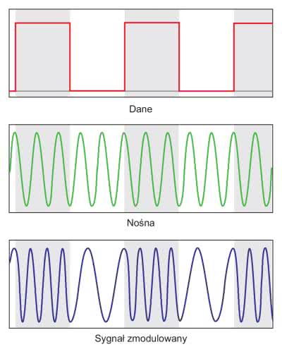 Innym rodzajem modulacji jest modulacja ASK, czyli modulacja amplitudy. W dużym uproszczeniu możemy przyjąć, że dla zera logicznego amplituda sygnału nośnej jest zerowa, a dla jedynki logicznej ma maksymalną wartość (rysunek 1b). Po stronie odbiorczej modem zamienia sygnał zmodulowany na ciąg zer i jedynek. Modulacja FSK i jej modyfikacje jest bardziej odporna na zakłócenia i dlatego jest chętniej stosowana.