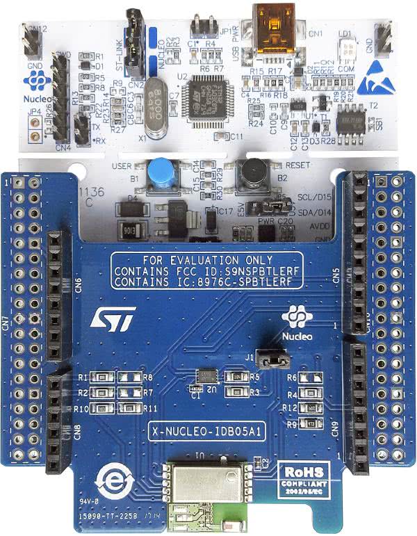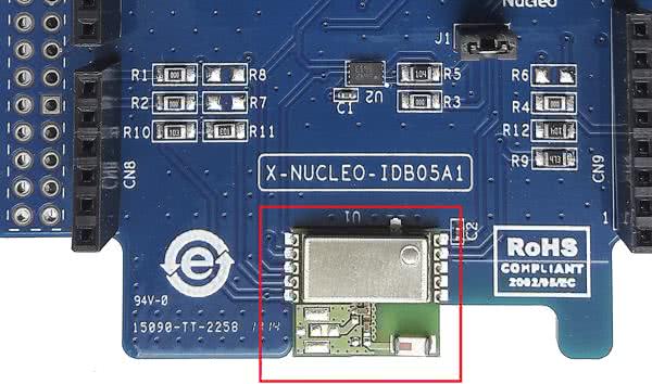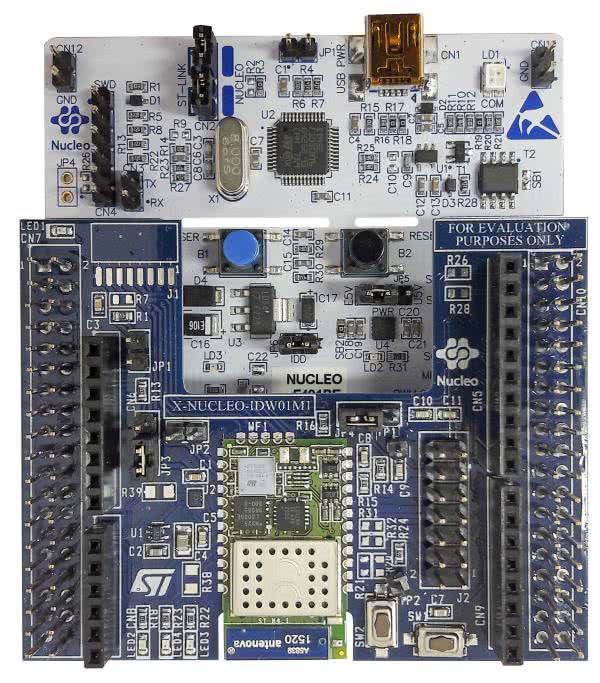 Obwody modułu z ekranowaną częścią radiową zostały umieszczone na płytce drukowanej z wyprowadzeniami przeznaczonymi do montażu powierzchniowego na płycie bazowej. To rozwiązanie dobrze się sprawdza w nowo projektowanych urządzeniach. Jednak, żeby można było przeprowadzić testy, chociażby w celu potwierdzenia przydatności w nowym projekcie, przygotowano moduł ewaluacyjny X-NUCLEO-IDW01M1 kompatybilny sprzętowo z modułami mikrokontrolerów serii STM32Nucleo.