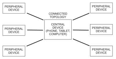 Komunikacja w sieci BLE zaczyna się od rozgłaszania przez węzeł sieci (advertiser), informacji, że oczekuje na połączenia. Węzły sieci scanners odbierające komunikat żądania na połączenie wysyłają komunikat z żądaniem połączenia connection request. Ten komunikat musi zawierać dane niezbędne do zestawienia połączenia. Jeżeli połączenie zostanie nawiązane, to węzeł scanners staje się węzłem master, a węzeł rozgłaszający advertiser węzłem slave. Tworzy się w ten sposób podsieć pracująca w topologii gwiazdy, gdzie jest jeden master, mogący komunikować się z jednym lub więcej węzłów slave. Urządzenie pracujące jako węzeł master nazywane jest Central Device, a urządzenia slave Pheriperial Device (rysunek 3). Central Device to najczęściej komputer, smartfon, tablet, itp..