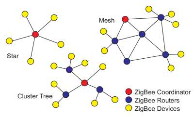 Warstwa sieciowa ZigBee natywnie obsługuje zarówno sieci w topologii gwiazdy (z punktem centralnym), klastrowe (drzewiaste) jak i sieci kratowe P2P (MESH). Każda sieć musi mieć jedno urządzenie koordynujące. W sieciach z topologią gwiazdy koordynatorem musi być węzeł centralny (rysunek 4).