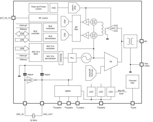 Moc wyjściowa TX jest regulowana przez programowe ustawianie napięcia wyjściowego stabilizatora LDO zasilającego nadajnik transceivera. Odbiornik może pracować w programowanych trybach z dużą wydajnością lub ograniczonym poborem mocy. Wbudowana w układ odbiornika automatyczna regulacja wzmocnienia ARW obejmuje zarówno tor wzmocnienia wielkiej częstotliwości jak i tor pośredniej częstotliwości. Źródłem sygnału zegarowego taktującego moduł RF jest oscylator kwarcowy o częstotliwości 32 MHz z wbudowanymi wewnętrznymi kondensatorami o programowanej pojemności. Rezonator 32 MHz oraz prosty dodatkowy układ filtrów w.cz. są jedynymi elementami zewnętrznym potrzebnymi do pracy. Antena może być wykonana ma płytce PCB. Można również dołączyć przez złącze RF antenę zewnętrzną na pasmo 2,4 GHz. Układ antenowy powinien posiadać na wejściu filtr pasmowo przepustowy lub dolnoprzepustowy ograniczający pasmo sygnału wejściowo/wyjściowego, oraz układ kompensacji niedopasowania impedancji.
