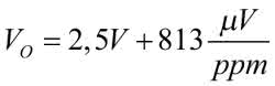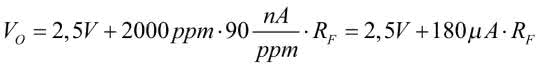 Podczas pracy z pojedynczym zasilaniem 5 V, na wyjściu wzmacniacza transimpedancyjnego U2-B dostępny jest zakres dynamiki równy 2,5 V, zgodnie z równaniem 1. Ustawienie AD5271 na 12,5 kΩ wykorzystuje dostępny zakres dla najwyższej czułości czujnika i pozwala na zachowanie około 10% zapasu dynamiki na wypadek przekroczenia zakresu pomiarowego. Używając typowej odpowiedzi czujnika równej 65 nA/ppm, napięcie wyjściowe VO można powiązać z stężeniem (w ppm) tlenku węgla w sposób określony równaniem 3: