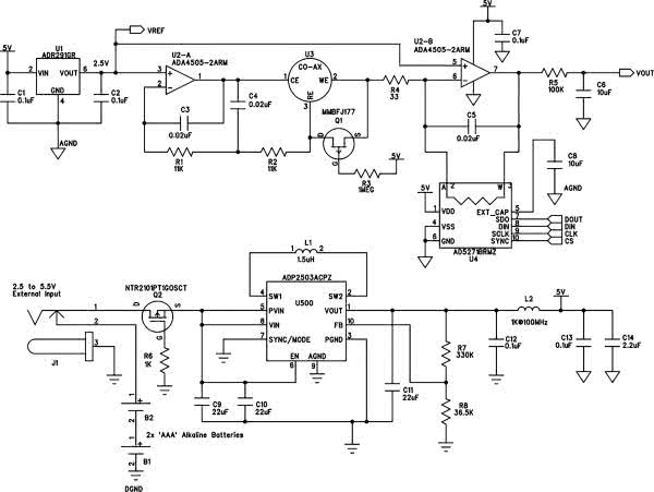 Na rysunku 2 został pokazany schemat przenośnego detektora gazu. Podwójny wzmacniacz mocy ADA4505-2 jest używany w konfiguracji z potencjostatem (U2-A) i konfiguracji transimpedancyjnej (U2-B). Wzmacniacz ten jest dobrym wyborem zarówno dla sekcji potencjostatu, jak i konwersji prąd-napięcie (transimpedancji), ponieważ charakteryzuje się niskim poziomem rozpraszanej mocy, jak i bardzo małym prądem polaryzacji wejścia.