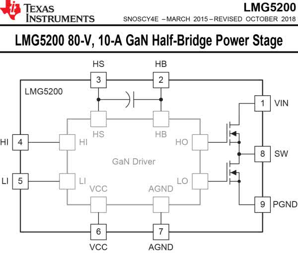 Na pewno wykorzystanie tranzystorów SiC i GaN wymaga dodatkowej wiedzy, ale jest ona dostępna w publikacjach wiodących producentów. Konstruktor wykorzystujący krzemowe MOSFET-y dość łatwo dostosuje się do specyfiki SiC i GaN. Ułatwieniem i atrakcyjną alternatywą są też gotowe scalone sterowniki dla nowych tranzystorów oraz tranzystory i półmostki z wbudowanym sterownikiem. Przykładem mogą być elementy oferowane przez TI. Rysunek 33 pokazuje uproszczony schemat wewnętrzny układu LMG5200 – (niskonapięciowego) półmostka GaN z wbudowanym sterownikiem.