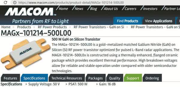 Rysunek 18 pokazuje fragment strony internetowej Macom z opisem 500-watowego tranzystora mikrofalowego. Jest to tranzystor HEMT GaN-on-Si, czyli czynna struktura GaN jest umieszczona na podłożu krzemowym (Si). Co prawda zakres pracy to „tylko” 1,2...1,4 GHz, ale moc jest imponująca.
