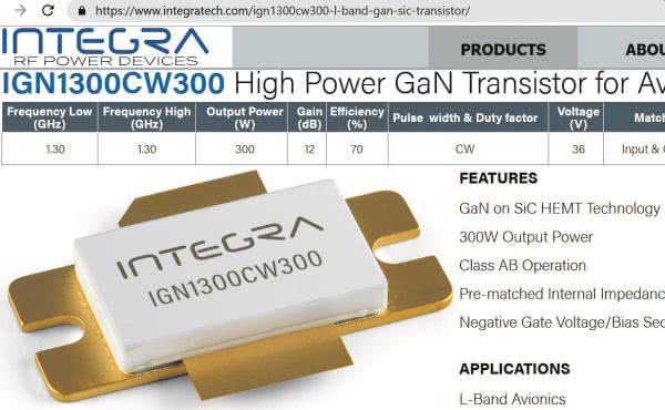 Innym przykładem może być tranzystor HEMT GaN-on-SiC Integra IGN1300CW300 o mocy ciągłej 300 W, przeznaczony do zastosowania w lotnictwie – rysunek 19. Tu struktura GaN umieszczona jest na podłożu z węglika krzemu (SiC).