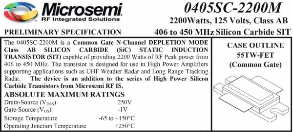 Rysunek 20 to fragmenty karty katalogowej Microsemi 0405SC-2200M. Jest to Silicon Carbide SIT, czyli odmiana tranzystora FET, zwana SIT (Static Induction Transistor). Tranzystor ten ma napięcie pracy do 250 V, moc w impulsie ponad 2 kW, a struktura z węglika krzemu może pracować w temperaturze nawet +250°C.