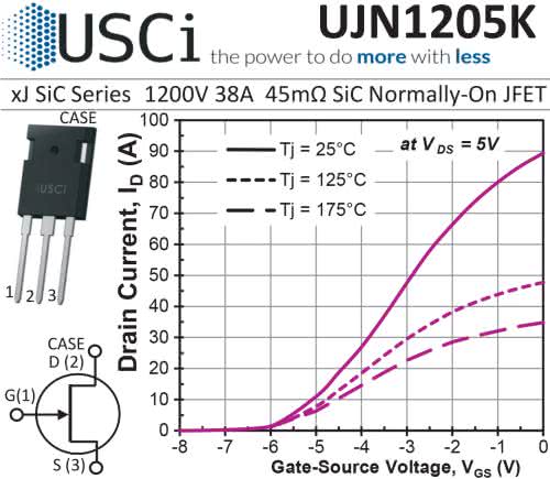 JFET-y mocy pojawiły się w ofercie United Silicon Carbide Inc. (USCi), na przykład 1200-woltowy, 38-amperowy UJN1205K. Rysunek 23 pokazuje fragmenty jego karty katalogowej.