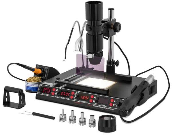 W pracowni, w której prowadzi się intensywne prace z elementami SMD lepszym rozwiązaniem od ręcznej stacji hot air jest stacja półautomatyczna zawierająca podstawę z podgrzewaczem i statyw dla nagrzewnicy (fotografia 7). Stacje takie umożliwiają lutowanie według zaprogramowanych profili temperaturowych, co jest szczególnie ważne dla technologii bezołowiowych.