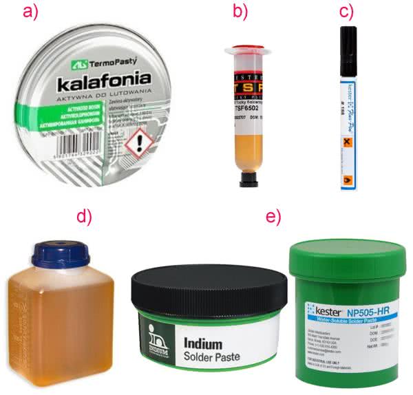 Do montażu SMD lepiej nadaje się topnik w postaci żelu konfekcjonowanego w pojemnikach stanowiących jednocześnie dozownik (fotografia 10b). Może być również nanoszony za pomocą wygodnego pisaka (fotografia 10c). Inną metodą przygotowania płytki do lutowania jest rozprowadzenie na płytce topnika płynnego lub występującego w postaci pasty (fotografia 10d, e).
