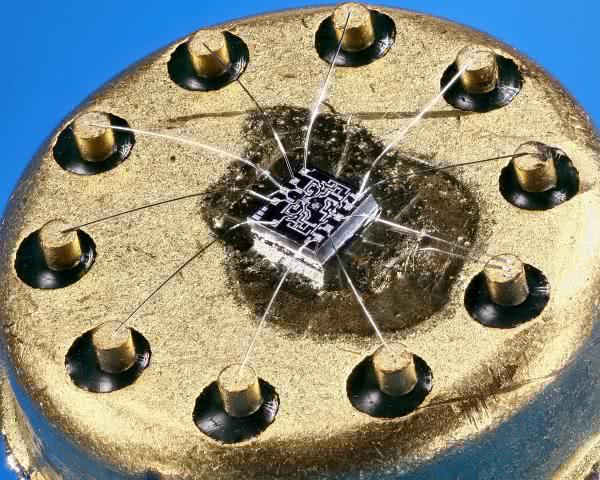 Widoczne są cienkie druciki łączące pola na strukturze krzemowej z nóżkami układu. Niemalże każdy element półprzewodnikowy wykonany jest w ten sposób. Cienkie połączenia, łączące piny zewnętrzne układu z polami na strukturze krzemowej mają relatywnie wysoką rezystancję, więc przy przepływie dużych prądów, może wytwarzać się na nich istotny spadek napięcia. W przypadku systemów cyfrowych, szczególnie logiki TTL czy CMOS, gdzie impulsowy pobór prądu może mieć znaczne wartości, powoduje to powstawanie zakłóceń, tzw. szumu, w systemie – ponieważ na potencjale masy występuje dodatkowe napięcie (wynikające ze spadku napięcia na doprowadzeniu do układu). Taki sam spadek dotyczy wszystkich napięć, które są mierzone względem tego potencjału masy. Dodatkowo, sprawę pogarsza fakt, że druciki tworzące połączenia w układzie mają też swoją indukcyjność, co jeszcze bardziej zwiększa spadki napięcia dla prądów impulsowych.