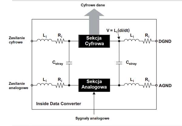 Układy logiczne, z setkami miliwoltów odstępu pomiędzy dwoma, dyskretnymi stanami logicznymi, są odporne na zakłócenia. Z drugiej strony, obwody analogowe są dość podatne na zakłócenia, zarówno na szynach zasilających, jak i w potencjale masy. Dlatego też rozdziela się masy analogowe i cyfrowe w układach scalonych. Pozwala to uniknąć przenikania do czułych sekcji analogowych zakłóceń, wytwarzanych przez systemy cyfrowe. Model sekcji zasilania układu mieszanego, uwzględniający pasożytnicze wartości pokazano na rysunku 1, gdzie Li to indukcyjność doprowadzenia, Ri to rezystancja doprowadzenia, a Cstray, to pojemność pasożytnicza, sprzęgająca ze sobą domeny cyfrową i analogową.