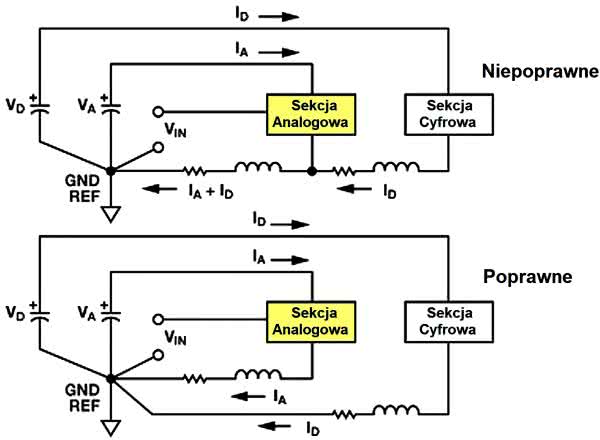 Masy analogowe i cyfrowe muszą w pewnym momencie zostać połączone, aby umożliwić odniesienie sygnałów do wspólnego potencjału. Ten punkt wspólny musi być starannie dobrany, aby nie wprowadzać prądów cyfrowych do masy części analogowej. Często najwygodniej jest dokonać takiego połączenia w sekcji zasilania. Przykład takiego systemu pokazano na rysunku 2.