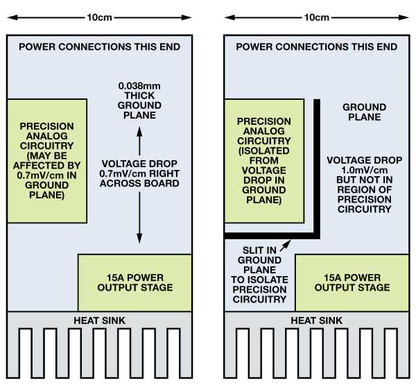 Rozwiązaniem tego problemu jest przecięcie wylewki masy izolującą szczeliną w sposób pokazany na rysunku 4 po prawej stronie. W ten sposób wylewka masy dzielona jest na dwie sekcje – dla czułych układów i dla elementów mocy. Spadek napięcia dla układów mocy rośnie do 1 mV/cm, ale jest to w pełni akceptowalna wartość, dla tego rodzaju układów. Przez masę pod sekcją precyzyjną natomiast nie płynie duży prąd powodujący powstawanie istotnych spadków napięcia.
