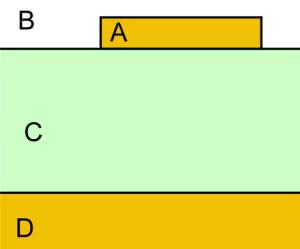Istnieje wiele rodzajów linii długich – koncentryczne, dwuprzewodowe itp. Na płytkach PCB najprościej realizuje się tzw. linie paskowe. Przekrój przez PCB z linią paskową pokazano na rysunku 5. Linia taka składa się z ścieżki (A) otoczonej powietrzem (B) na jednej warstwie i wylewki masy (D), znajdującej się na kolejnej warstwie. Pomiędzy nimi znajduje się dielektryk płytki drukowanej (C). Wyliczanie impedancji charakterystycznej linii paskowej jest rzeczą dosyć skomplikowaną i wykracza poza ramy tego artykułu. Impedancja ta jest funkcją stałej dielektrycznej laminatu płytki drukowanej, szerokości ścieżki i odległości pomiędzy ścieżką a wylewką masy (grubością laminatu).