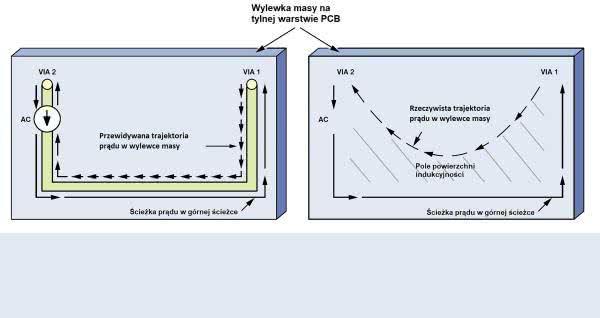 Rozważmy linię długą w kształcie litery U, która transmituje prąd zmienny i jest zwarta na obu końcach do wylewki masy poprzez przelotki VIA 1 i VIA 2 (rysunek 6). W tej ścieżce prąd oczywiście biegnie po jej trajektorii, natomiast w wylewce masy prąd wraca trajektorią pokazaną na rysunku 6 po prawej stronie. Jest to wypadkowa dwóch efektów. Z jednej strony, pole magnetyczne indukowane przez górną ścieżkę stara się wymusić przepływ prądu pod ścieżką (zgodnie z zasadą prawej dłoni – prąd w ścieżce wymusza prąd w wylewce masy, płynący w odwrotnym kierunku), a z drugiej strony niezerowa impedancja wylewki powoduje, że prąd wybiera możliwie krótką ścieżkę. Kształt, jaki przybiera trajektoria, po której płynie prąd wynika z faktu, że im większe pole pomiędzy ścieżką, a trajektorią powrotną, tym większa jest indukcyjność. Oznacza to, że im wyższa jest częstotliwość, tym bliżej ścieżki płynie prąd w wylewce masy.