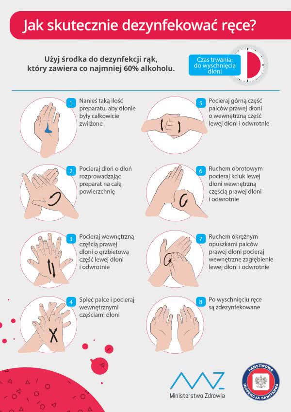 W przypadku dezynfekcji rąk, Ministerstwo Zdrowia wydało oficjalną infografikę z rekomendowanym sposobem dezynfekcji dłoni. Zaprezentowano ją na rysunku 1. Jest ona zgodna z zaleceniami WHO, co do sposobu ich dezynfekcji. Do dezynfekcji dłoni rekomendowane jest wykorzystanie środków zawierających, co najmniej 60% etanolu.