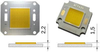 - Dużej mocy - Szczególnie ciekawe są diody serii FLAT (płaskie). Wyróżniają się zwartą konstrukcją o bardzo małej grubości całkowitej – od 1,5 do 2,2 mm w zależności od mocy. Wersja 100 W (LED-ALS-PP100W-W-lm12K-140 FLAT) ma wymiary 46×40×2,2 mm, a światłość wynosi 11500 lm. Wersja 10 W (LED-ALS-P10000mW-W-lm1100-140 FLT RW4K) ma wymiary 20×20×1,5 mm a światłość wynosi 1100 lm.