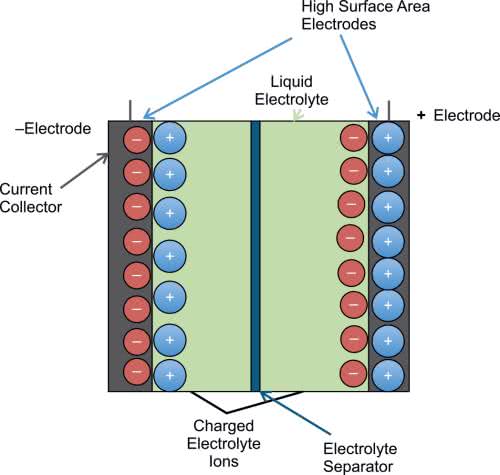 Superkondensatory różnią się budową i zasadą działania od klasycznych kondensatorów elektrolitycznych, choć z pozoru wydają się być do nich podobne. Zasadnicza różnica polega na tym, że najczęściej występujące w praktyce superkondensatory mają postać nieco bardziej złożoną – ich nazwa, electric double-layer capacitor (EDLC) wskazuje na dwuwarstwową strukturę. Oznacza to, że okładziny kondensatora są oddzielone od elektrolitu przez „własne” warstwy dielektryka, co sprawia, że model zastępczy takiego kondensatora zawiera de facto dwa, szeregowo połączone kondensatory. Pomiędzy okładzinami znajduje się dodatkowo warstwa przepuszczalnego dla jonów separatora, którego celem jest zapobieganie przypadkowemu zwarciu elektrod. Schemat konstrukcji superkondensatora EDLC został pokazany na rysunku 1.