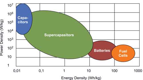 - Gęstość energii – parametr ten, wyrażany w jednostkach energii na kilogram masy danego źródła (zwykle [Wh/kg]) dla superkondensatorów jest wielokrotnie niższy, niż w przypadku jakiegokolwiek rodzaju akumulatora. Oznacza to, że zgromadzenie tej samej ilości energii, co w określonym akumulatorze (np. pakiecie Li-Ion) wymagałoby użycia wielokrotnie większego (a więc też cięższego) superkondensatora.
