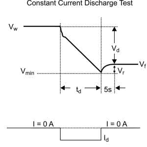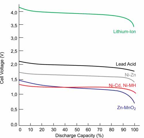 - Charakterystyki rozładowania – jak wspomniano wcześniej, jedną z najistotniejszych różnic pomiędzy akumulatorami, a kondensatorami, jest kształt ich napięciowych charakterystyk rozładowania. W przypadku akumulatorów napięcie przez długi czas spada powoli, aż do momentu osiągnięcia pewnego obszaru krytycznego, powyżej którego następuje gwałtowny spadek prowadzący do głębokiego rozładowania – o ile urządzenie nie wyłączy się samoczynnie odpowiednio wcześnie. Przykładowe kształty charakterystyk dla popularnych rodzajów akumulatorów pokazno na rysunku 3. Dla superkondensatorów charakterystyka rozładowania jest początkowo nieliniowa (rysunek 4), ponieważ zmienny w czasie spadek napięcia na rezystancji ESR „nakłada się” niejako na stopniowe obniżanie napięcia, spowodowane malejącą ilością ładunku elektrycznego zgromadzonego w kondensatorze. Dopiero po pewnym czasie krzywa przyjmuje charakter liniowy – odpowiada za to dalsza redukcja ładunku zmagazynowanego w pojemności superkondensatora.