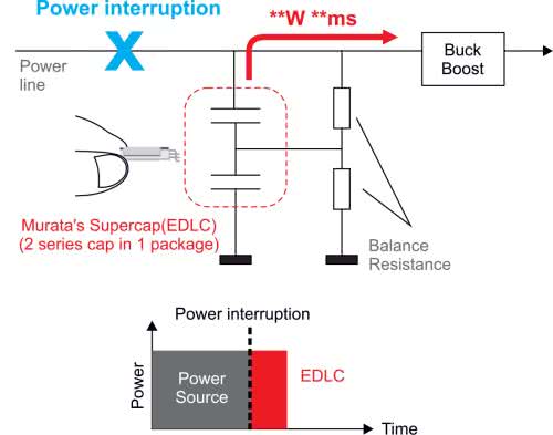 Zasadę działania systemu podtrzymania zasilania z użyciem superkondensatorów pokazano na rysunku 5. Po odcięciu głównego źródła zasilania szeregowo połączone superkondensatory oddają energię do odbiornika za pośrednictwem przetwornicy DC/DC. Dodatkowe rezystory – kosztem zmniejszenia efektywności układu poprzez wprowadzenie strat energii – ustalają balans napięć, zapobiegając przebiciu jednego z kondensatorów.