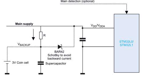 Dioda Schottky’ego zabezpiecza układ przed powstawaniem prądów wstecznych, dzięki czemu ładowanie kondensatora jest możliwe jedynie poprzez rezystor. Układ jest dostosowany do zasilania ze źródeł napięcia stałego o napięciu wyższym o co najmniej 0,3 V, niż wymagane do poprawnej pracy procesora napięcie podtrzymujące. Istotnym wymaganiem jest zapewnienie wysokiej impedancji źródła po jego wyłączeniu, gdyż w przeciwnym wypadku superkondensator będzie rozładowany bezpośrednio do źródła, co znacząco zredukuje czas podtrzymania pracy układu.