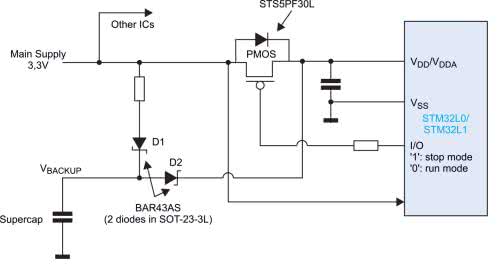 Znacznie lepszym i bardziej uniwersalnym rozwiązaniem jest obwód zasilania przedstawiony na rysunku 7. Dodatkowa dioda Schottky’ego włączona szeregowo z rezystorem R zapobiega rozładowywaniu superkondensatora przez główne źródło zasilania i/lub inne bloki urządzenia. Tranzystor polowy umożliwia programowy wybór źródła napięcia – w stanie przewodzenia zapewnia on ścieżkę o niskiej impedancji, podłączającą wyprowadzenia zasilania procesora do głównego zasilacza urządzenia, zaś odłączenie (po wykryciu spadku napięcia przez linię Wake-up) umożliwia rozpoczęcie rozładowywania superkondensatora, po wcześniejszym wprowadzeniu mikrokontrolera w tryb obniżonego poboru mocy (STOP).