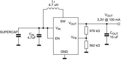 Na rynku dostępnych jest wiele miniaturowych konwerterów spełniających to wymaganie – jako przykład warto przytoczyć rodzinę układów MCP1640 firmy Microchip, zdolnych do pracy przy startowym napięciu wejściowym w zakresie już od 0,65 V. Podstawowy schemat aplikacyjny został pokazany na rysunku 8. Innym, godnym uwagi przykładem, jest układ LM2621 – przy prądzie zasilania na poziomie 80 µA jest w stanie dostarczyć prąd wyjściowy do 1 A, co pozwala na zastosowanie w urządzeniach wymagających większej mocy (w tym przypadku konieczny będzie superkondensator o dużej pojemności lub bateria kilku mniejszych, połączonych równolegle). - Sprawność – tak jak w każdym innym przypadku, wysoka sprawność przetwornicy DC/DC pozwala możliwie najpełniej wykorzystać stosunkowo niewielką ilość energii, zgromadzonej w superkondensatorze. Warto jednak mieć na uwadze, że w wielu aplikacjach – w szczególności z segmentu ultra-low power – znacznie ważniejsza okazuje się wartość natężenia prądu zasilania pobieranego przez samą przetwornicę, gdyż to właśnie ten parametr staje się główną składową strat energii wprowadzanych przez konwerter DC/DC do układu o niewielkim zapotrzebowaniu na moc zasilania. Wspomniany wcześniej układ MCP1640 wymaga do prawidłowego działania prądu o natężeniu zaledwie 19 µA, dzięki czemu może z powodzeniem zostać zastosowany w urządzeniach niskomocowych.
